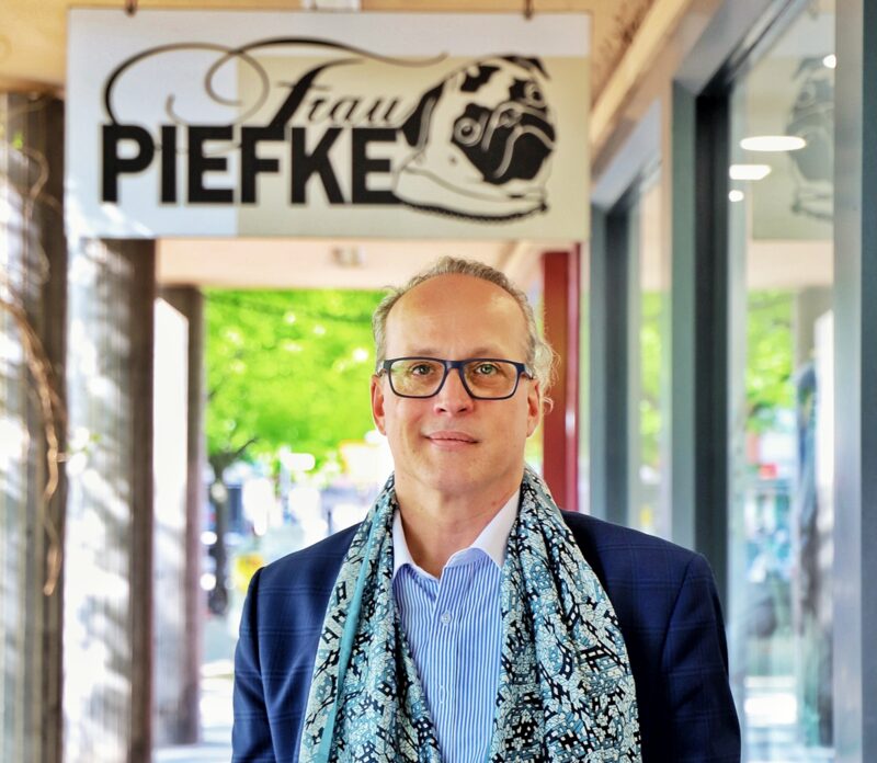 Den Namen Frau Piefke verdankt das Geschäft Bernards erster Mopsdame. Rund 16 Jahre begleitete sie ihn täglich zur Arbeit- und war dabei durchaus auf eigene Faust unterwegs. „Sie ist regelmäßig alleine durch den Seltersweg spaziert“, erinnert er sich. Die kleine Hündin mit der schicken Perlenkette war bekannt. Ihre Nachfolgern Fräulein Piefke, zog es nie in die weite Welt. Und der kürzlich verstorbene Herr Piefke genoss lieber das heimische Wohnzimmer als den lebhaften Seltersweg.