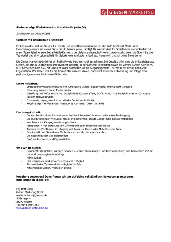 Du bist kreativ, hast ein Gespür für Trends und willst Berufserfahrungen in der Welt des Social Media- und Eventmanagements sammeln? Dann bist du bei uns genau richtig! Als Werkstudent für Social Media und unterstützt du unser Team dabei, unsere Social-Media-Kanäle zu bespielen sie strategisch weiterzuentwickeln. Wenn du Eigeninitiative, Teamgeist und eine Leidenschaft für digitale Kommunikation mitbringst, freuen wir uns auf deine Bewerbung!